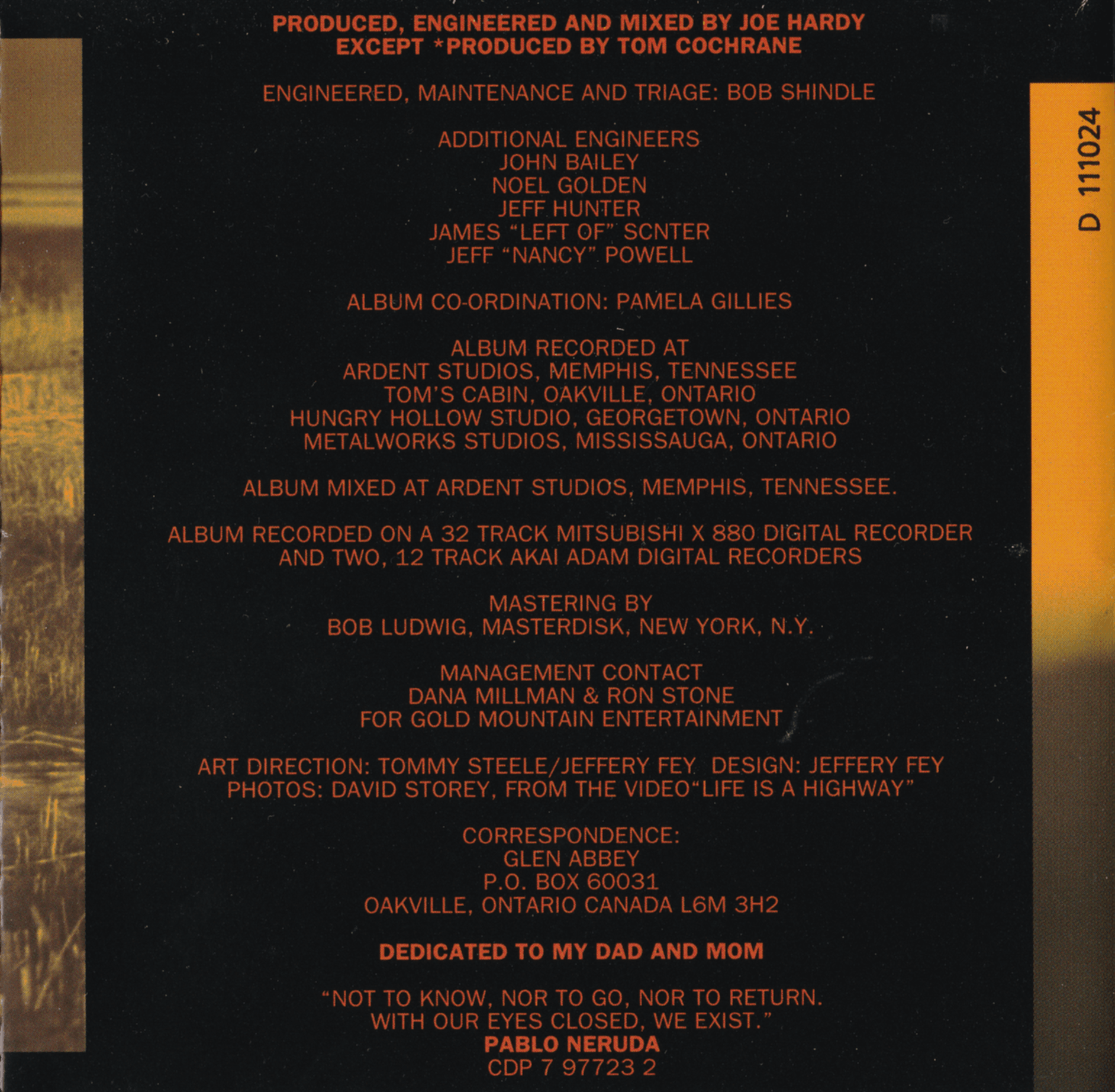 Tom Cochrane: Pre-Production, Electric and Slide Guitars, Vocals, Drum Arrangement
