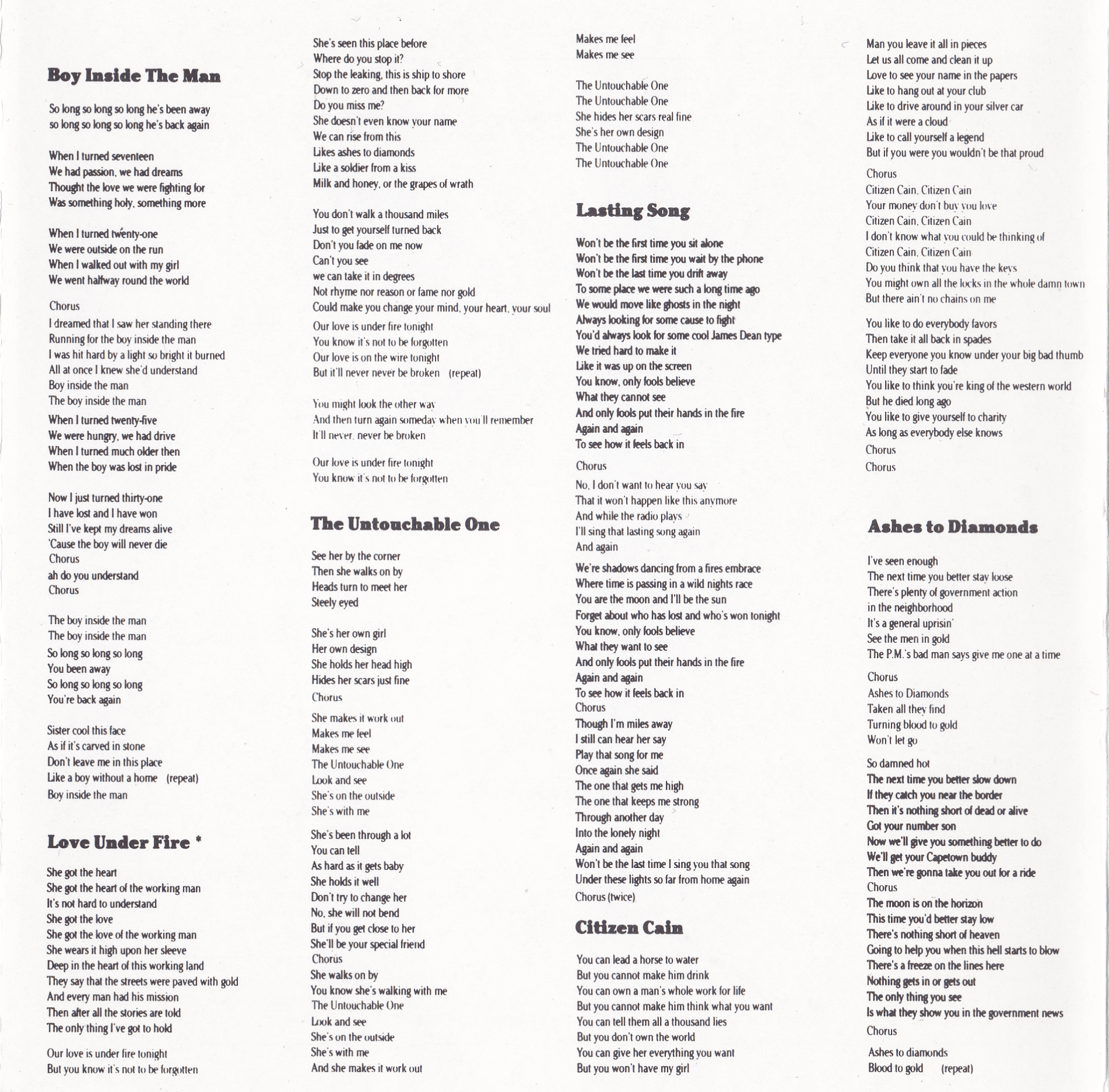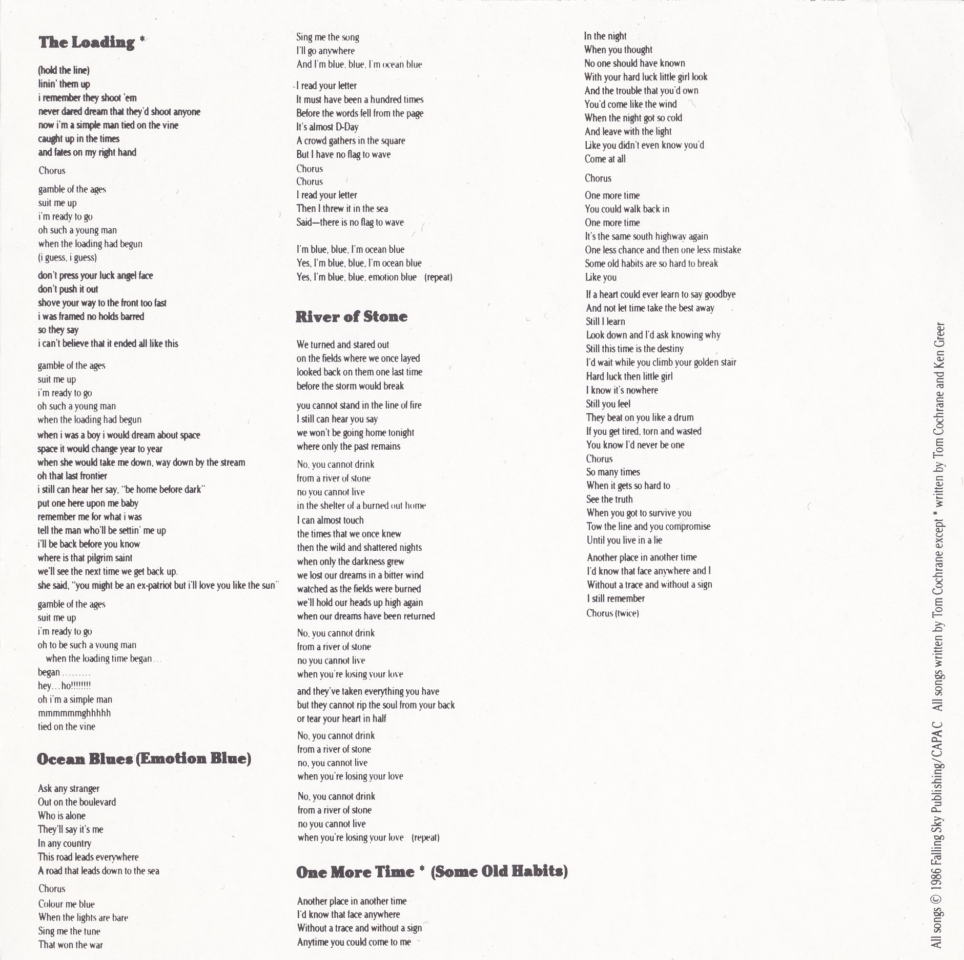 All songs written by Tom Cochrane except **by Tom Cochrane and Ken Greer